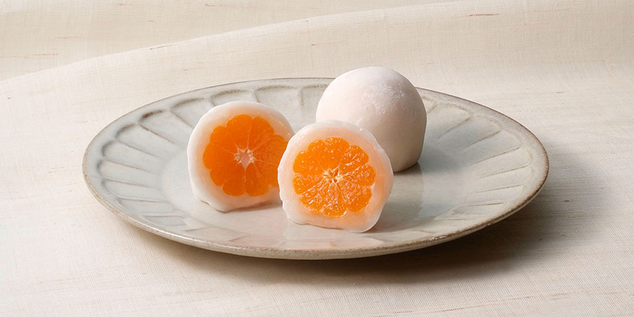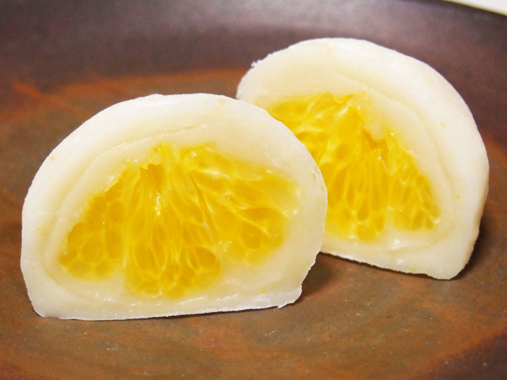 因島産のジューシーなはっさくを、広島県産のもち米で包んだ地産地消のフルーツ大福です。はっさくがもたらす美容効果は高いので、女性には特におすすめ* みかんの皮が入った、こだわりの求肥(ぎゅうひ)もポイントです。
