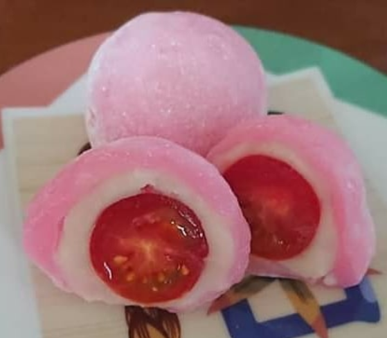 健康野菜の代表格・トマトを使用した大福です。フルーツ大福ならぬ野菜大福ですが、変わり種としてご紹介します* 皮まで甘いトマトを、ピンクに色付けした求肥(ぎゅうひ)と白餡で優しく包んだ一品です*