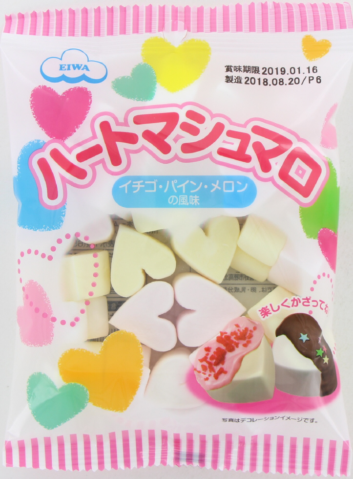 なんとハートのマシュマロが3色入り!それぞれ味も違うようです。(ピンク…イチゴ風味、黄色…パイン風味、白色…メロン風味) 自分でチョコがけしたり、ラッピングして、ちょっとしたプレゼントにするのもいいかもしれません。