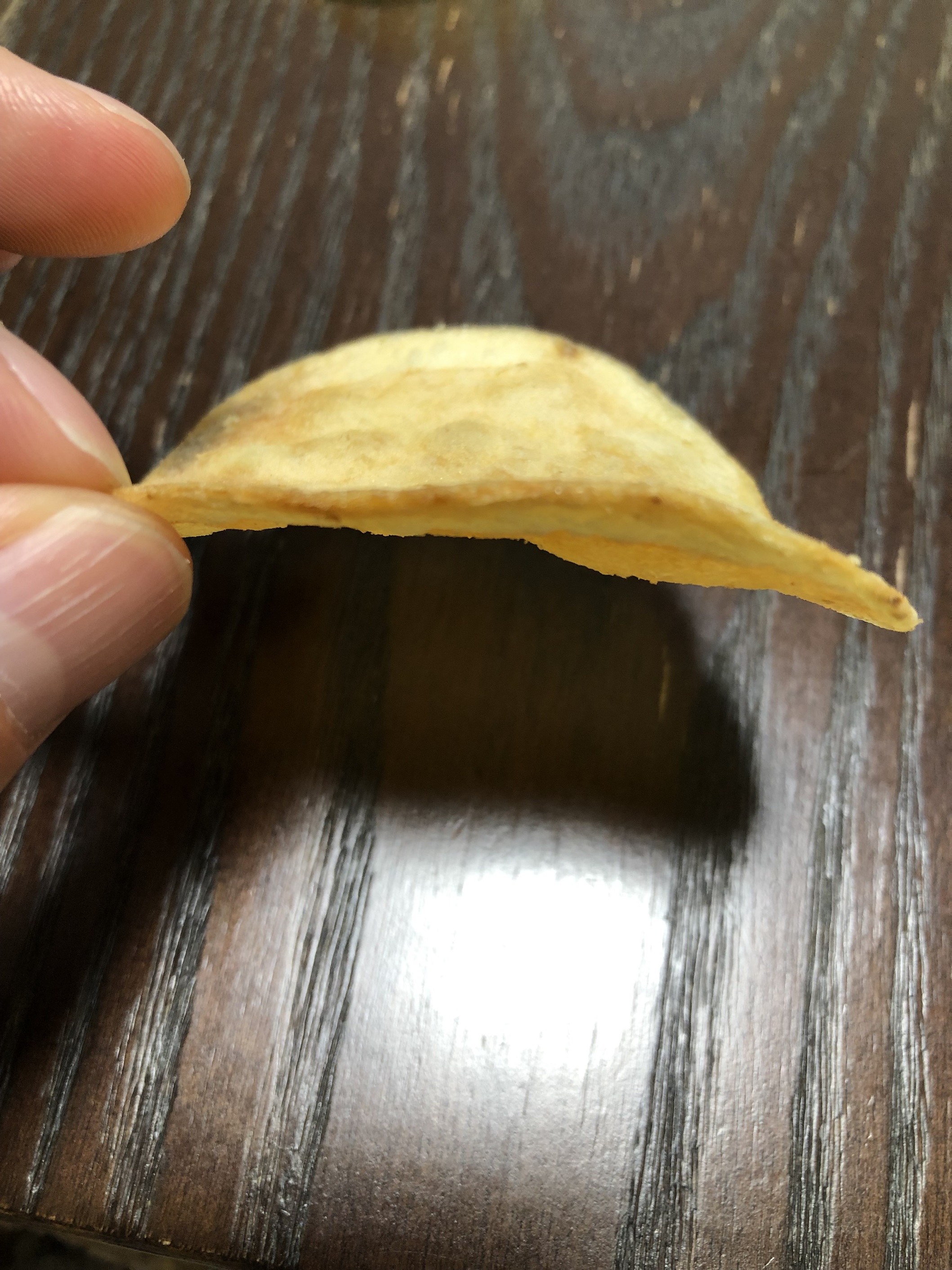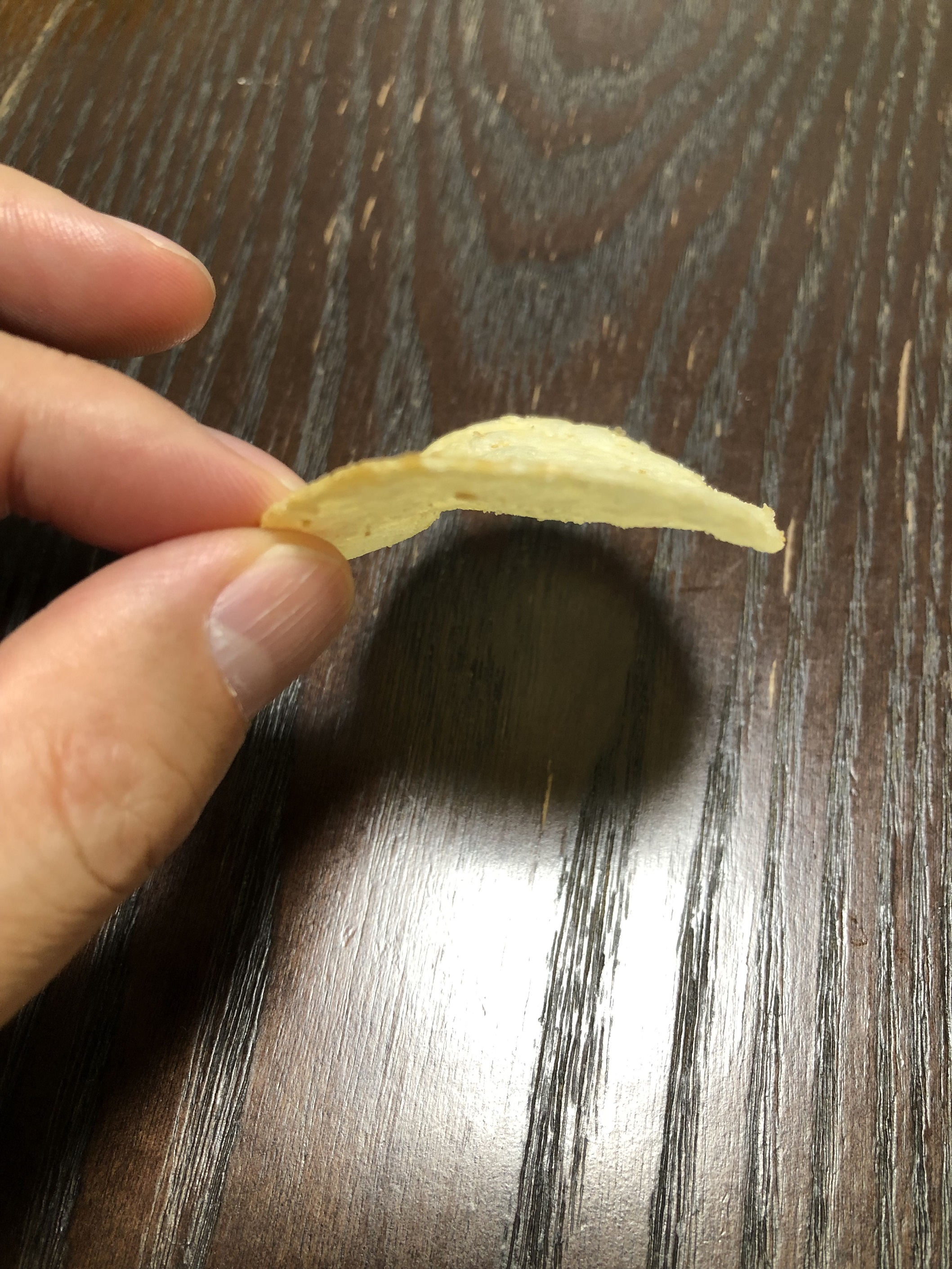通常のポテトチップスとは違いじっくりと揚げたポテトチップスのため、ポテトチップスが縮み、見た目は小さく感じますが、旨味が凝縮されており噛めば噛むほど旨味が感じられます。