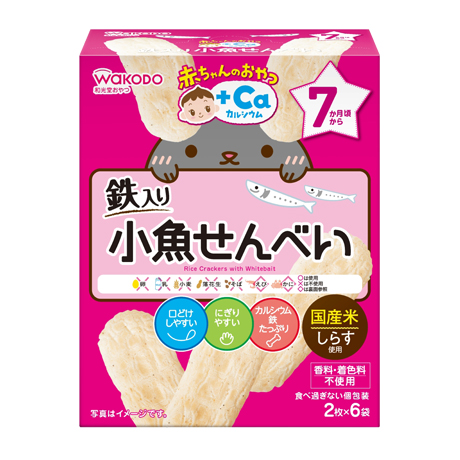 和光堂の赤ちゃんのおやつシリーズは、7ヵ月から、9か月から、1歳から、1歳4ヵ月からとそれぞれの年齢別にお菓子と商品化しています。今回紹介している小魚せんべいは、しらす粉末が入っているため鉄分を補給できます。