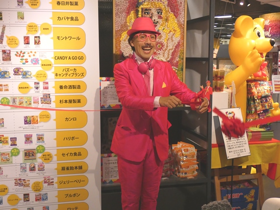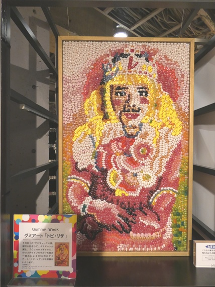 今年から「レ・ロマネスク」のTOBIさんがグミウィーク大使に就任されました。毎年恒例となったグミアートの展示、今年はなんと5,000粒以上使用された「トビ・リザ」です。