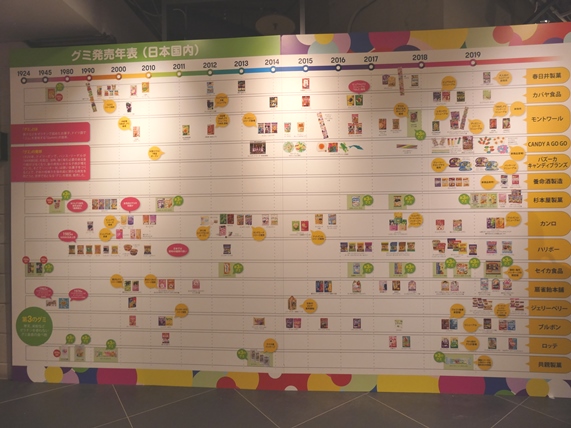 グミウィークで展示されている商品のメーカー別年表。実はグミの歴史って長いんですよ!